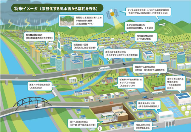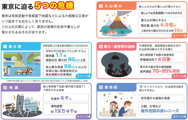 2040年代にめざす強靭化された東京の姿を明らかにしたうえで、その実現に向け、都の全庁共通の前提条件として設定した「共通の目線」を踏まえ、今後、都が取り組むべき事業を、5つの危機(「風水害」、「地震」、「火山噴火」、「電力・通信等の途絶」および「感染症」)に複合災害を加えてとりまとめたもの。